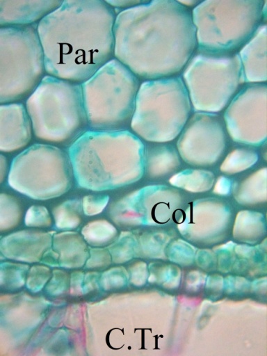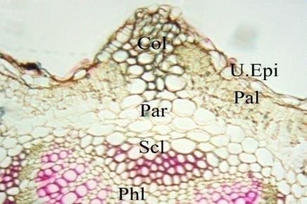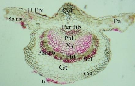 Abbreviations: U. Epi-Upper epidermis, Col-Collenchyma, Par-Parenchyma,Scl-Sclerenchyma, Tr-Trichomes, Gt-Ground tissues, Per fib-Pericyclic fibre, Sp par-Spongy parenchyma, Pal-Palisade, Xy-Xylem, Phl-Phloem.
