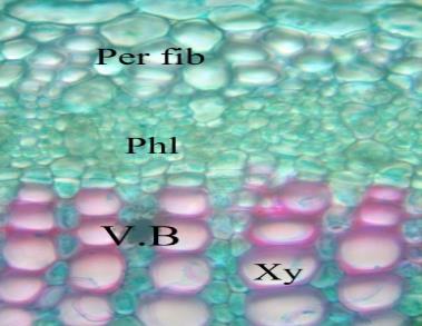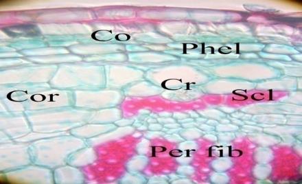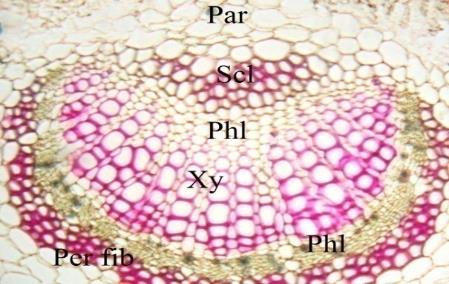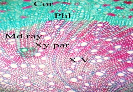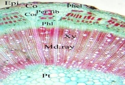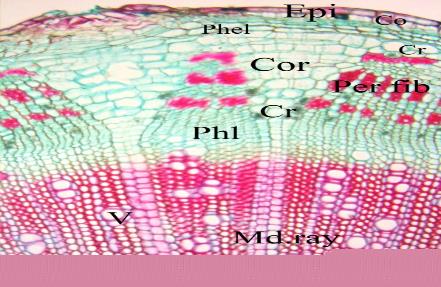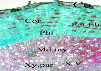 Abbreviations: Co-Cork, Cor-Cortex, Par-Parenchyma, Phl-Phloem, Xy-Xylem, Par fib-Pericycle fibre, Xy-Xylem, X V-Xylem vessel, Md ray-Medullary rays.