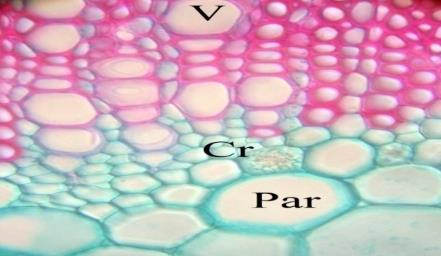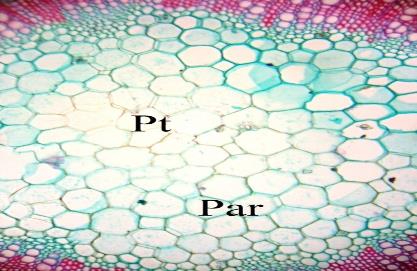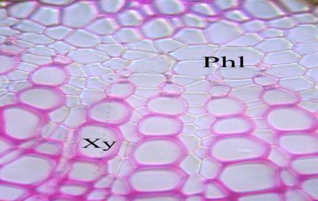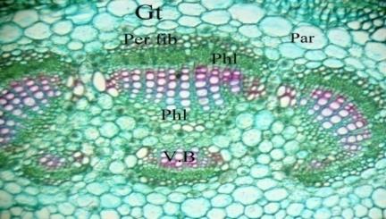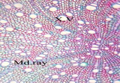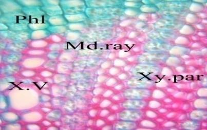 It is about 3-9 in numbers in each group. It consists of thick walled sclerenchymatous cell which are highly lignified. Cortex region is followed by vascular bundle, consisting of xylem and phloem. Arrangement of the vascular bundle is collateral. Phloem consists of isodiametric parenchymatous cells which are about 9-10 layers, few cells contain cluster of calcium oxalate crystal. Xylem vessels are lignified and it may have reticulate, annular or spiral thickening. Xylem vessels are surrounded by lignified xylem parenchyma. Medullary rays are present which are biseriate or multiseriate. It becomes diverge at phloem region and converge towards pith region. Pith occupies the major part at the center. It consists of parenchymatous cell with intercellular spaces. At the center, parenchymatous cells are bigger in size and it becomes smaller towards periphery. Few cells of pith contain cluster of calcium oxalate crystals.
