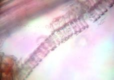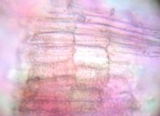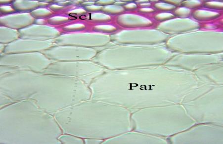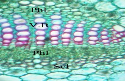 Transverse sections of stem are shown in fig. 8(a), fig. 9(a,b) and Fig.10(a,b, c) at magnification of 5 x×5 x, 5 x×10 x and 5 x×45 x respectively. The epidermis consists of single layer, rectangular shaped, closely packed parenchymatous cell without having intercellular spaces. Cork cell consists of 2-3 layers of parenchymatous cell present below the epidermis. Cork cell is followed by phellogen, which are about two layers of rectangular parenchymatous cell. Below the phellogen, cortex region is present, which is about 8-9 layers of parenchymatous cell. In the cortex zone, groups of pericycle fibres are present.