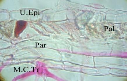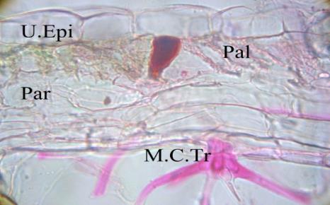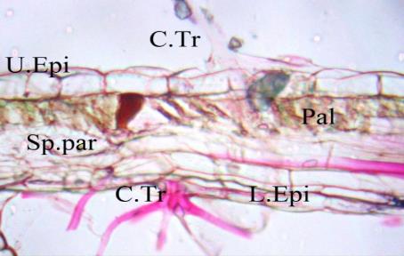 Abbreviations: U. Epi-Upper epidermis, C. Tr-Trichomes, M. C. Tr-Multicelluar covering trichomes, Par-Parenchyma, Pal-Palisade, St-Stomata, X. V-Xylem vessel, L. epi-Lower epidermis.