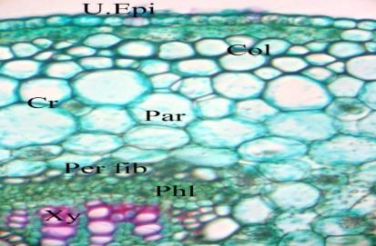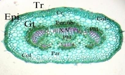 Abbreviations: Epi-Epidermis, Col-Collenchyma, Gt-Ground tissue, Tr-Trichomes, C. Tr-Covering trichomes, Cr-Crystal, Par-Parenchyma, Scl-Sclerenchyma, Phl-Phloem, Xy-Xylem, Par fib-Pericycle fibre, Xy-Xylem, V. B-Vascualr bundle.
