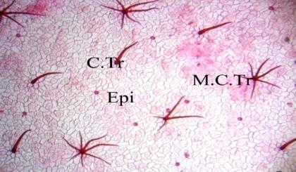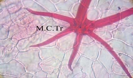 The microscopical features found in the lamina of the plant are shown in fig. 3 (a, b) and fig. 3 (c, d) at magnifications of 5 x×10 x and 10 x×45 x respectively. Lamina of leaf is dorsiventral. Upper epidermis consists of single layer of rectangular parenchymatous cells. It shows the presence of unicellular covering trichomes and opening of stomata. Upper epidemis is followed by mesophyl. Mesophyl consists of palisade cell and spongy mesophyl. Palisade cells are arranged loosely in single layer, and are radially elongated. Spongy mesophyll contains 2-3 layers of loosely arranged rectangular parenchymatous cell. Mesophyl region is followed by lower epidermis. Lower epidermis is resembled to upper epidermis. Leaf contains stellate (star shaped) multicellular covering trichomes, which are considered as its characteristic feature.