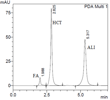 The objective of the present study was to develop and validate a simple, sensitive and cost effective RP-HPLC method for simultaneous estimation of ALI and HCT in tablet dosage form. Moreover, the other objective of the developed chromatographic method was to obtain better resolution between ALI, HCT and FA (fumaric acid). The chromatographic conditions were optimized to achieve the best resolution and peak shape for both the drugs. The separation of components were achieved on Enable C18 column with a mobile phase consisting of 0.2% triethylamine in water (pH 6 was adjusted with orthophosphoric acid) and methanol (10:90 %v/v) at a flow rate of 1 ml/min was employed with PDA detection at 280 nm. The retention time of ALI and HCT was found to be 5.315±0.0264 and 2.824±0.0027 min, respectively, are shown in fig. 2.