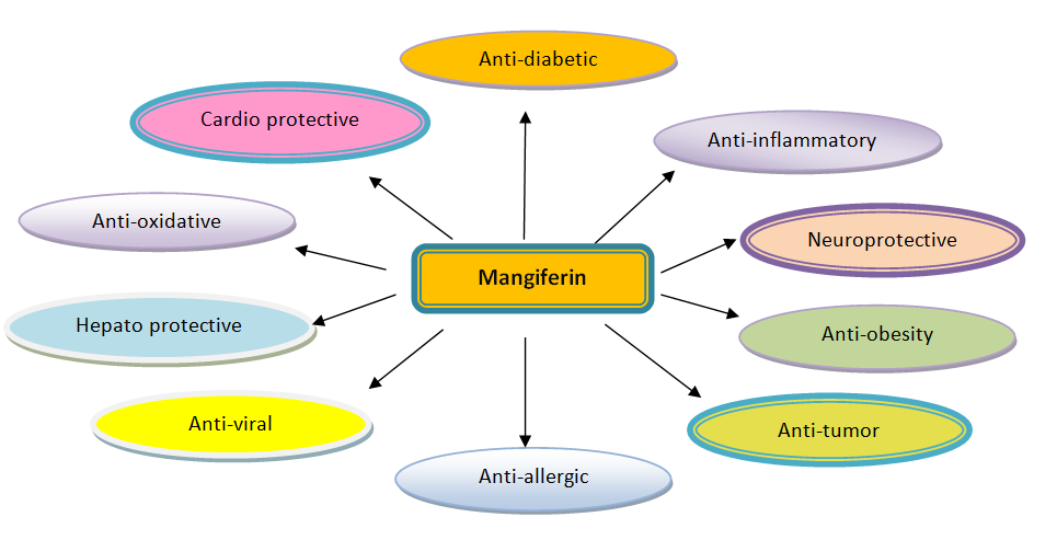 Generation of reactive oxygen species leads to cellular membrane damage and is implicated in the pathology of obesity, diabetes, atherosclerosis and cardiovascular disorders. Obesity is characterized by systemic increase in reactive oxygen species levels,which are known to reduce insulin sensitivity [27]. Mangiferin has been shown to possess higher free radical scavenging capacity, and the ferric reducing ability of plasma (FRAP) compared with other anti-oxidants such as L-ascorbic acid and Trolox, a vitamin E analog. Human Umbilical Vein Endothelial Cells (HUVEC) treated with mangiferin showed significantly higher survival under hydrogen peroxide induced oxidative stress [28].