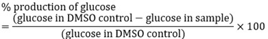Glucose in the culture plates was assayed by the GOD-POD assay kit protocol. Briefly, 50 µl of the incubated medium was transferred to a 96 well ELISA plate. The GOD-POD color reagent (200 μl) was added to each well. The color was developed in the dark at 37 ˚C for 30 min and then the optical density was evaluated at 505 nm and the percentage production of glucose was estimated by applying the convention: