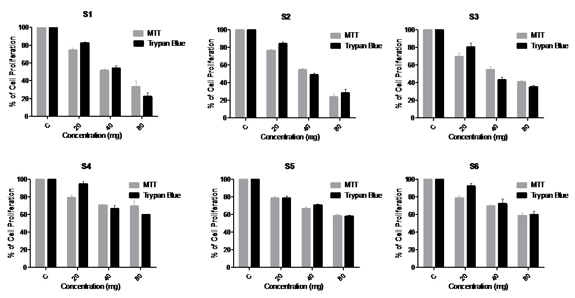 Fig. 1: Antiproliferative effects of oil samples (S1-S6) at 20, 40 and 80 mg/ml concentrations against Human CM leukemic cells in MTT assay and trypan blue assay after 48 h treatment. C stands for DMSO treated vehicle control