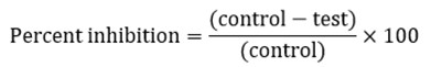 The HRBC membrane stabilization assay was carried out [35] with slight modifications. The blood was collected from a healthy donor, who was not taken NSAIDS for 2 w prior to the experiment. The collection of blood was carried out as per the ICMR guidelines Govt. of India (vide O. M. No 19015/53/1997-IH Pt). The equal volume of Alsever solution (2% dextrose, 0.8% sodium citrate, 0.5% citric acid and 0.42% NaCl) was added to the blood sample and centrifuged at 2500rpm. The obtained packed cells were washed with isosaline and 10% suspension was made by using the isosaline. Diclofenac (50µg/ml and 100µg/ml) was used as a positive control. The different concentrations of oil samples S1-S6 (10-40 mg/ml) are taken and to each concentration, 1 ml of phosphate buffer, 2 ml of hypo saline & 0.5 ml of packed cells were added. Then the test tubes were incubated for 20 min at 37 ˚C and centrifuged at 3000 rpm for 15 min. The supernatant containing hemoglobin was estimated at 560 nm spectrophotometrically. The percentage of hemolytic or HRBC protection was calculated by using the following formula: