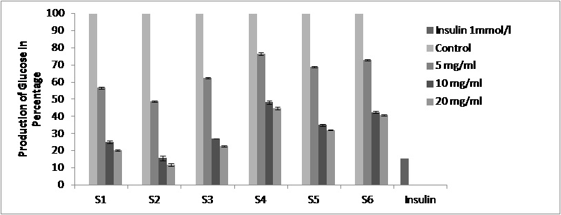 Fig. 2: The hypoglycemic effects of insulin and different oil samples (S1-S6) on gluconeogenesis in rat liver slices showing glucose production in percentage