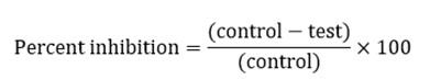 The protein anti-denaturation assay was carried out [36] with the few modifications. The reaction mixture contains 1 ml of 0.2% of bovine serum albumin in tris buffer saline (pH 6.8) and oil samples S1-S6 in different concentrations (10-40 mg/ml). The control contains 1 ml of 50 µl methanol and 1 ml bovine serum albumin. Diclofenac (50 µg/ml & 100 µg/ml) is used as a positive control. Then the tubes were kept in a water bath at 72 ˚C for 5 min and cooled. The tubes were centrifuged at 3000rpm for 10 min. The absorbance of the supernatant was determined by spectrophotometer at 660 nm. The percentage of denaturation was calculated by using the following formula: