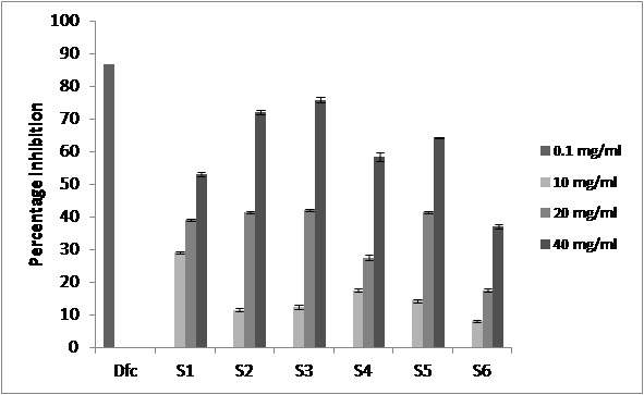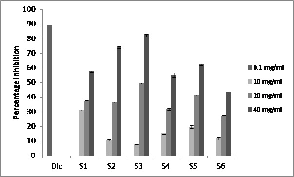 Fig. 4: The anti-inflammatory effects of different oil samples (S1-S6) by anti-denaturation activity showing percentage inhibition