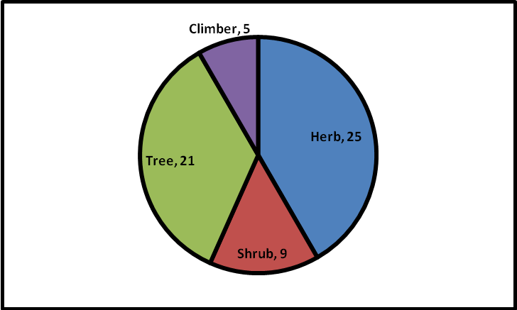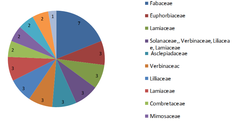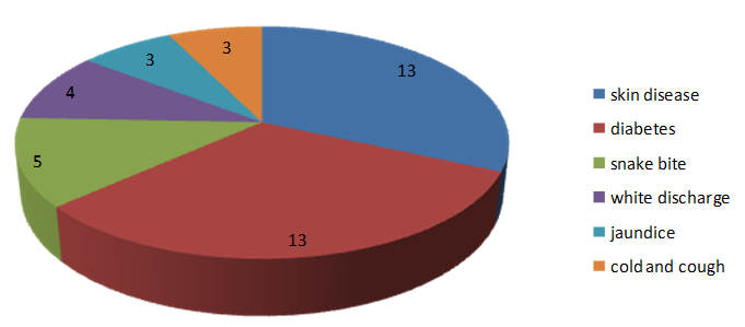 A total of 60 ethno medicinal plants belonging to 37 families were recorded during the survey. The leaves were mostly used parts, followed by fruit, root, bark, flower, stem and latex as shown in fig. 2. Herbs (25) were dominant medicinal plants followed by trees (21), shrubs (9) and climbers (5) as shown in fig. 3. The dominant families of ethno botanical importance were Fabaceae with 7 species followed by Euphorbiaceae, Lamiaceae, Solanaceae, Asclepiadaceae, Verbinaceae, Liliaceae, Lamiaceae with 3 species each, and Combretaceae, Mimosaceae, Rutaceae and Myrtaceae with 2 species each and the family Apocynaceae was represented with single species only as shown in fig. 4. These plants are being used to treat various ailments such as injuries, wounds, mouth ulcers, fever, diarrhoea, ulcers, swelling, snake bite, skin care, toothache, asthma, cough and cold diabetes and cancer. Many plant species were used to treat the same disease as shown in fig. 5. For example Aegle marmelos and Caesalpinia bonduc are used to treat diabetes. The medicinal plant species used for treating most commonly occurring diseases are as follows; Skin diseases are treated by 13 plant species; diabetes is cured by 13 plant species, followed by 5 plant species for snakebite, and 4 plant species are used for treating white discharge. Ethno medicines have received renewed global attention of scientists in India and elsewhere in recent past because of their local acceptability. Plant extracts used in ethanol medical treatment are enjoying great popularity, but many of them lack scientific validation[24]. Nevertheless, Ethnopharmacological studies are expected to provide sources for the discovery of new drugs of plant origin [25] the plant species reported in the present study were cross checked with the available literature. Some of these plant species were already identified for the same purpose, but the parts used, method of drug preparation and dosage was different. The medicinal plants cited in the present study have different kinds of curative properties in other regions as well. For example Caesalpinia bonducella is used in Dysmenorrhoea, Ziziphus maruitiana Lam. In diabetes, the fruit juice is given for constipation, in Bellary District, Karnataka [26], and Aloe Vera Linn. used in wound healing, Citrus medica L. The fruit used for nail infection and as a refresher in Dharmapuri Tamilnadu [12] and Allium cepa L. is used in the treatment of ulcer in Gadag district of Karnataka [27].