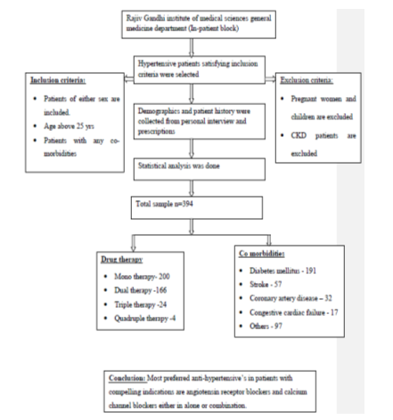 Results: A total of 394 hypertensive patients with different comorbidities were included in which 251(63.70%) males and 143(36.29%) females were present with a mean (SD) age of 59.21±1.54. The most commonly reported first three co-morbidities along with hypertension were diabetes mellitus 191 (48.47%), stroke accounts for 57 (14.46%) and coronary artery disease in 32 (8.12%). Monotherapy was given in almost 200 (50.76%) patients and dual drug therapy was indicated in 166 (42.13%) patients, triple therapy was used only in 24 (6.09%) patients in the total sample size. Quadruple therapy is the least preferred combination therapy accounts only in 4 (1.01%) patients.