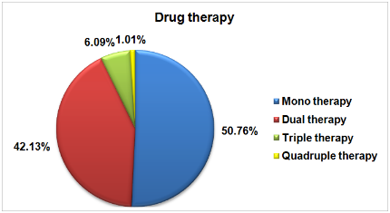 Quadruple therapy is the least preferred combination therapy accounts only in 4 (1.01%) patients.Table 1: Sample distribution based on gender