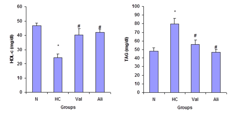 Fig. 1: Effect of Val and Ali administration on serum HDL-c and TAG. Results are expressed as mean±SD, n= (6), (*P<0.05). *significantly different from (N) group. # significantly different from (HC) group