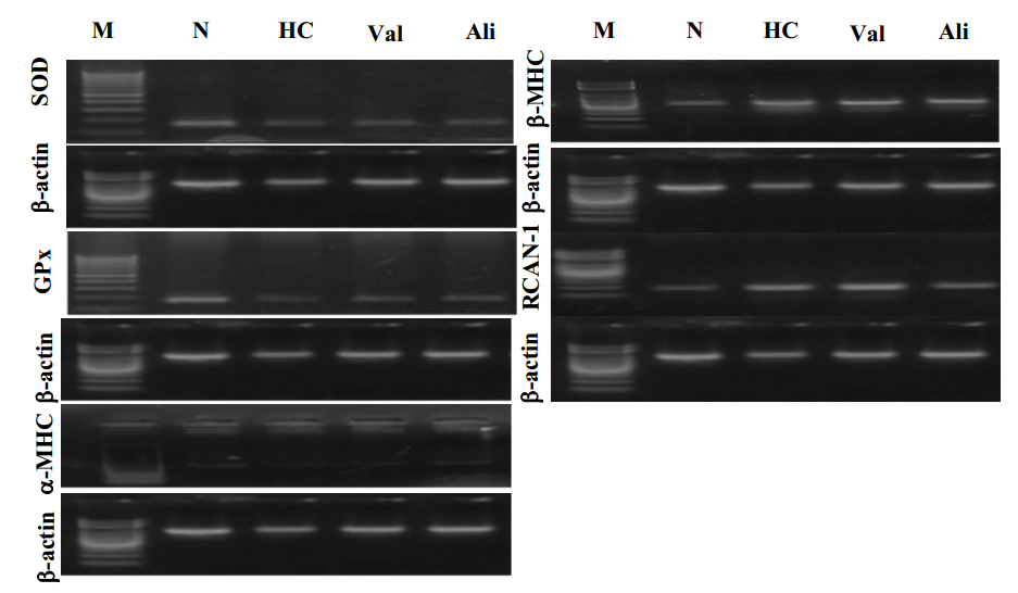 On the other hand rats receiving either Val or Ali had elevated SOD, GPx and α-MHC as well as the reduced level of β-MHC and RCAN-1 gene expression, compared with HC group, (**P<0.001). (fig. 2).