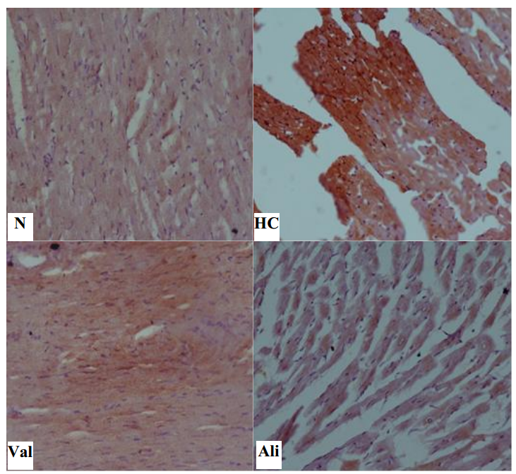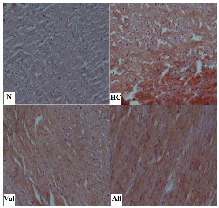 Immunohistochemical examination of the cardiac muscle of HC by using NFκB and iNOS antibodies revealed the remarkable increase in their activity as indicated by strong brown positive cytoplasmic reaction, in comparison with N rats. Meanwhile, Val or Ali treated rats showed remarkable reduction in their levels as indicated by moderate cytoplasmic reaction (faint stain), in comparison with HC group (fig. 4 and fig. 5).