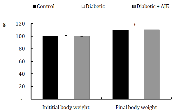 Fig. 1. Depicts that diabetic rats showed marked decline (P<0.05) in their body weight (-4.55%) when compared to the control group. Supplementation of AJE to the diabetic rats for 30 days returned the body weight towards normalcy.