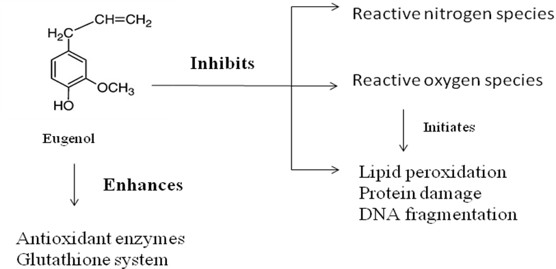 Eugenol and Clove oil have the ability to scavenge the free radicals [6, 14-16]. At lower concentrations, it acts as an antioxidant by inhibiting DPPH and Hydroxyl free radicals and at higher concentrations it acts as pro-oxidant by forming free radicals [17]. This property of eugenol and its isomer isoeugenol was tested by the iron-mediated lipid peroxidation and auto oxidation of Fe2+ [18]. These functional properties of eugenol strongly suggested the dual role that possessed the versatility of eugenol. Besides the free radical scavenging activity, eugenol also has nitric oxide scavenging activity, and strong reducing power while determined by Griess reagent and FTC method respectively [6]. Not only the direct free radical scavenging activity in the chemical system, eugenol also protected in vitro and in vivo ROS generation and ROS-induced lipid-protein and DNA damage as well as increased the cellular anti-oxidant, specifically, glutathione system (fig. 3) [3,19-23]. Wie et al. reported that eugenol reversed neuronal excitotoxic or oxidative injury and had protective effect against N-methyl-D-aspartate–induced neurotoxicity [24].