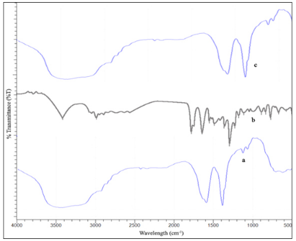 Fig. 1: FTIR spectrums of (a) PCL-PHB microspheres without drug (b) Pure drug (Tamoxifen) (c) PCL-PHB microspheres with drug
