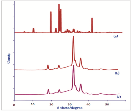 Fig. 4: XRD patterns of (a) pure TAM, (b) drug loaded microsphere, and (c) pure blend microspheres