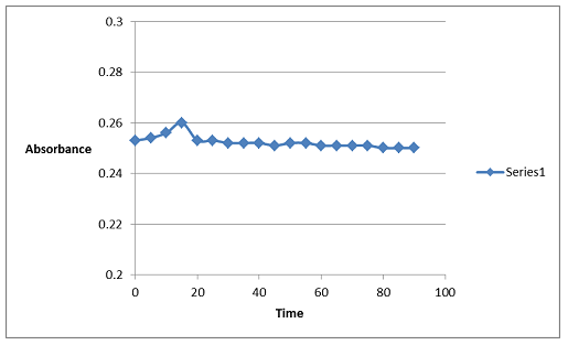 A 10 µg/ml concentration of Salbutamol Sulphate was prepared as a working solution and the absorbance was recorded after a period of every 5 minutes in a time span of 90 minutes. The data obtained are shown in the table 4 and fig. 4