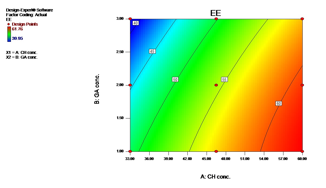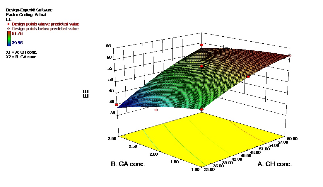 A 32 level full-factorial design includes 9 full factorial design points with the help of Design Expert version 8.0.7.1. According to the model, total 9 experiments were performed. This design involves dependent variables and independent or controlled variables A and B. In the present study, experiment was conducted considering concentration of CH and GA as independent variables. The dependent variables were Y1; percentage entrapment efficiency and Y2; percentage drug release.