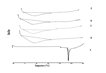 Fig. 3: DSC of A: OLM; B: A1; C: B1; D: C1; E: C2