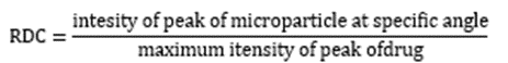 XRD pattern was used to confirm amorphous nature of the generated microparticles. XRD is a powerful technique for determining the presence of crystalline structure in drug and generation or reduction of crystal form during the process of formation of microparticles [20]. As shown in fig. 4, unique XRD patterns showed peak intensities of drug and microparticles with CH at various diffraction angles (2θ). It can be seen that the microparticles exhibited spectra with same peak positions (patterns) compared to drug. Further, the relative intensities of their diffraction peaks were modified which might be attributed to the different crystals and arrangement of molecules. The relative degree of crystallinity (RDC) is the comparative study of crystallinity of microparticles with drug. It can be calculated by following formula