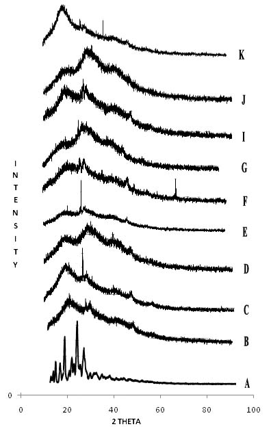 Fig. 4: XRD of A: OLM; B: A1; C: A2; D: A3; E: B1; F: B2; G: B3; I: C1; J: C2; K: C3.