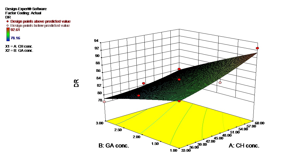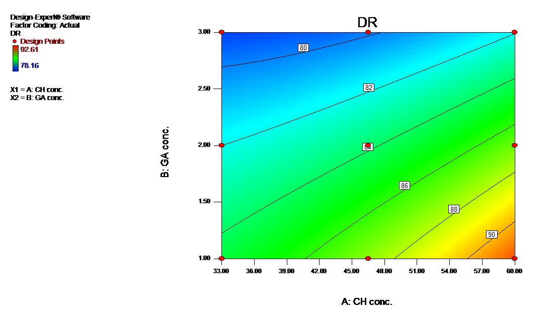 Fig. 7 shows the profound effect of concentration of the CH and GA on the % drug release of the formulation. The counter plot clearly indicates that the % DR is increased with increase in concentration of CH and GA. From the formulations, it was observed that the maximum % DR was obtained with the formulation C1.