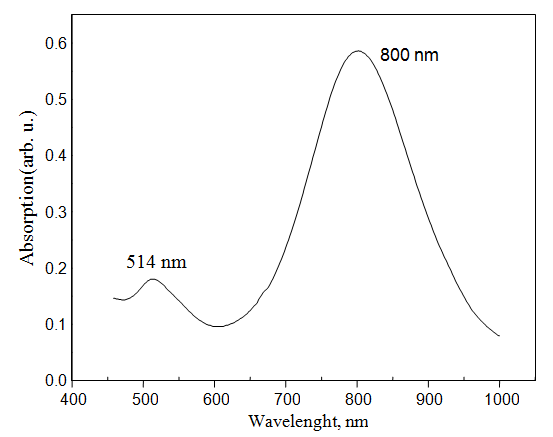In this figure, it was found that, the surface plasmon absorption of gold nanorods have two bands, a strong long-wavelength band (800 nm) due to the longitudinal oscillation of electrons and a weak short-wavelength band around 514 nm due to the transverse electronic oscillation[33, 34].