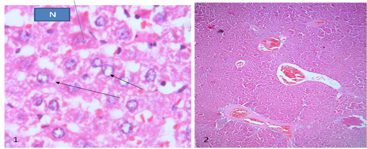 Fig.3:Photomicrographs of sections in male rat liver injected with single dose of PEG-gold NRs (0.9 mg/kg), (1) intravenously injected showing intranuclear inclusions (arrows) and cell necrosis (N). (2) intramuscularly injected showing portal tracts dilatation, congestion, edema, perivascular inflammation (Hx&E. X1000, 100)