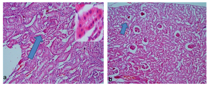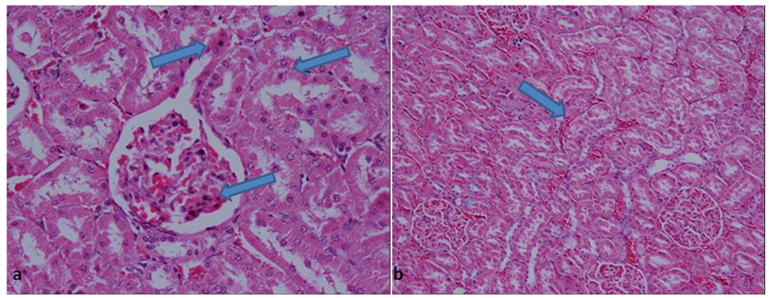 Fig.7: Photomicrographs of kidney from (a) male rats and (b) female rats treated (intramuscularly injected) with PEG-gold NRs for six months showing few changes in Bowman capsules and tubular epithelial cells in the form of pyknosis (arrows), coagulative necrosis (arrow) inter-tubular hemorrhage (Hx&E. X400, 200)
