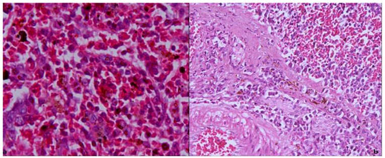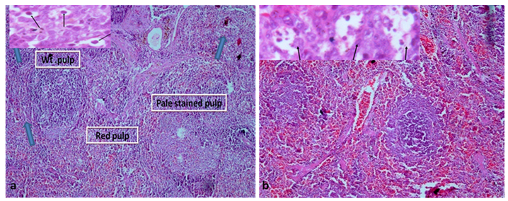 Fig.8: Photomicrographs of spleen parenchyma from (intravenously injected) female rats with PEG-gold NRs for six months (a), showing the increased in macrophages and phagocytosis indicated by hemosiderin pigments. (b) male rats, showing congestion in the artery of the follicle and swollen reticuloendothelial cells, fibrosis, vacuolation and apoptosis in white pulp cells, loosely packed red pulp accompanied by hemosiderin pigmentation (Hx&E. X1000, 400)