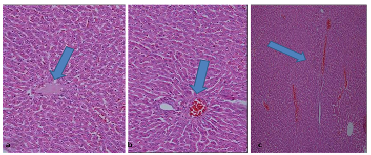 Fig.6: Photomicrographs of liver parenchyma from (a, b) male rats and (c) female rats (subcutaneously injected) with PEG-gold NRs for six months showing normal hepatocytes around the central vein and the portal tract with minimal congestion and inflammation in portal tracts (Hx&E. X200, 100)