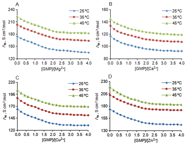 To study the interaction of GMP with nitrate salts of Mg2+, Ca2+, Cu2+and Zn2+ions in methanol, the molar conductance (ɅM) of the solution was monitored as a function of mole ratio of GMP/metal ion by titration of metal ion solutions (2 × 10-4 M) with 2 × 10-3 M solution of GMP. The stoichiometry of the complexes formed was evaluated by these mole ratio plots at different temperatures (25 °C, 35 °C and 45 °C). As evident from fig. 1 (A-D) there is a gradual decrease in ɅM with increase in GMP concentration for all four cations. This indicates that M2+-GMP complexes have less ionic mobility compared to solvated cations. Further, the slope of each molar conductance-mole ratio plots changes at a point where GMP/cation ratio is about 2, which is an evidence for the formation of 1:2 complexes [M2+:(GMP)2]. Further addition of GMP resulted in no significant change in molar conductance.