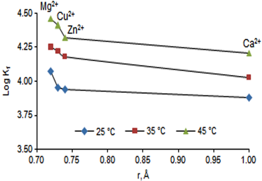 Fig. 2: Variation of log Kf values for M2+-GMP (M: Mg2+, Ca2+, Cu2+and Zn2+) complexes versus the ionic radii in methanol at 25 °C, 35 °C and 45 °C