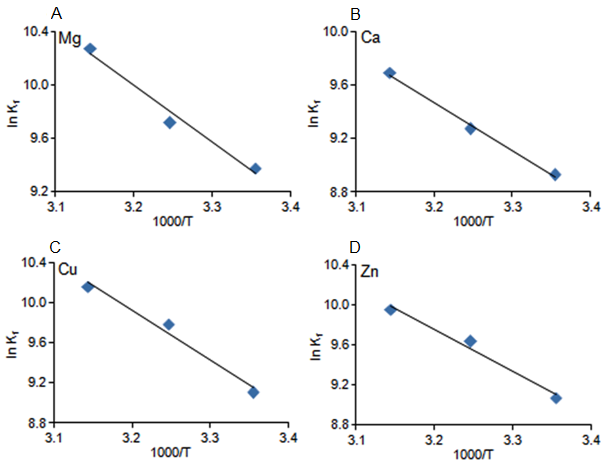 Fig. 4: van’t Hoff’s plot of ln Kf vs. 1000/T for the metal complexes with glimepiride (A) Mg2+, (B) Ca2+, (C) Cu2+and (D) Zn2+in methanol