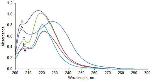 Fig. 6: Absorption spectra of (A) glimepiride (1.0 × 10-4 M) and its complexes with (B) Mg2+, (C) Ca2+, (D) Cu2+and (E) Zn2+in methanol