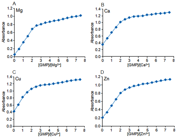 Fig. 7: Mole ratio [GMP]/[M2+] plots for (A) Mg2+, (B) Ca2+, (C) Cu2+and (D) Zn2+in methanol at their respective wavelength maxima at 25 °C