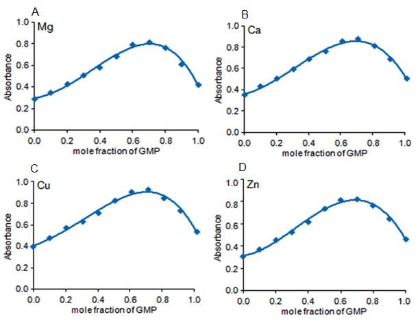 Molar ratio method [25] and Job’s method of continuous variation [26] were used to determine the stoichiometry of metal ion-GMP complexes. For mole ratio method, series of solutions containing fixed amounts of cations (1.0 × 10-4 M) and varying concentration of GMP in methanol were prepared. For Job’s method, the absorbance of complex of a series of solutions containing metal ions (1.0 × 10-4 M) and GMP (1.0 × 10-4 M) in different mole fractions but constant total concentration was measured. Prior to spectrophotometric measurements all the solutions were equilibrated at 25 °C at the respective wavelength maxima.