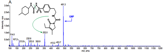 LC-MS analysis of solutions containing cations and GMP in methanol showed clear evidence of 1:2 (M: L) complex formation. Fig. 9(a-e) presents Q1 full scan mass spectra (100-1200 amu) for GMP and its complexes with Mg2+, Ca2+, Cu2+and Zn2+cations respectively in the positive ionization mode. All fig. (fig. 9b-e) contain protonated precursor ions corresponding to the formation of 1:2 complexes, parent drug (m/z 491) and a major fragmentation product of GMP (m/z 352) due to elimination of methylcyclohexyl carbamoyl group (fig. 9a). Further, all protonated precursor complex ions were found at 2 mass units higher [M (GMP)2+2H+] compared to their excepted masses. This further confirms formation of charged complexes and is supported by the high conductance value for the complexes as shown previously in table 2. Further, an extended mass scan up to 1700 amu revealed no fragments corresponding to higher order complex formations (fig. not shown). All the chromatograms showed overlapping peaks corresponding to the protonated complex ion and parent ion. However, it was not possible to resolve the peaks by subtle changes in the mobile phase composition on ACE column.