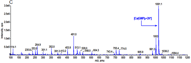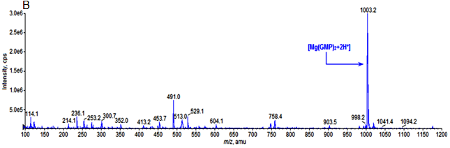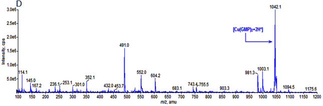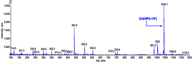Standard solutions of GMP and metal ions (2 × 10-4 M each) were prepared in methanol and mixed in 1:1, 1:2, 1:3 and 1:4 (M: GMP) stoichiometry ratio respectively. Aliquots of 10 µl were then injected into the LC-MS system and the mass spectra were recorded from m/z 100-1200.