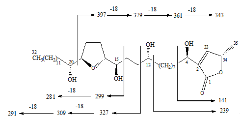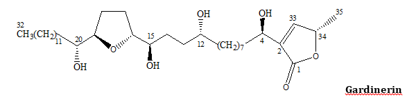 HRFABMS of gardinerin (m. p. 55-57 °C; [α]D[25]+6o (c 0.01, CH2Cl2) showed a self-protonated molecular ion at m/z 597.4752 [MH]+(calcd. 597.4730) indicating a molecular formula of C35H64O7. The 1H, 13C and DEPT NMR spectrums obtained for gardinerin showed 35 carbon atoms with 64 attached hydrogen atoms. The 13C NMR clearly indicated seven carbon atoms bearing oxygen atoms and one ester carbonyl. Gardinerin had a UV absorption at 228 nm (lmax, CH2Cl2) indicating that it had an α, β-unsaturated methyl–γ-lactone moiety. 1H and 13C spectral data confirmed the presence of an α, β-unsaturated methyl–γ-lactone moiety bearing a secondary methyl group (δH 1.42, H-35; δC 19.1, C-35; δH 5.05, H-34; δC 78.1; δH 7.20, H-33; δC 152.0, C-33; 131.2, C-2; 174.6, C-1) (table 1), a common feature in Annonaceous acetogenins [29].