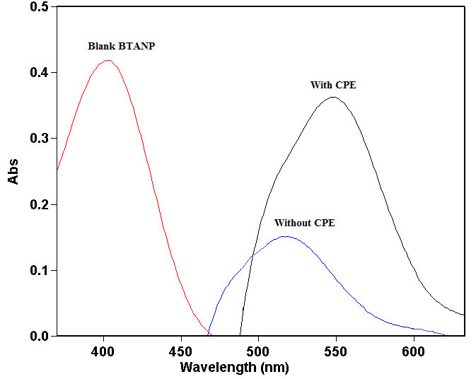 The enhancement factor was calculated as the ratio of the slope of the calibration graph with pre concentration CPE procedure to the slope of the calibration graph without CPE was also approximately 43. The consumptive index is defined as the sample volume, in milliliters, consumed to reach a unit of enrichment factor (EF): CI = Vs (ml)/EF were found to be 0.58, where Vs is the sample volume.