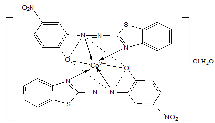 The separation of metal ions by CPE methods involves prior formation of a metal complex by an appropriate complexing agent, with sufficiently hydrophobic character, and subsequent extraction into a small volume of surfactant-rich phase. The required hydrophobic character of the extracted copper complexes is guaranteed by the high lipophilic nature of the complexing agent (BTANP) used. In the present work, this characteristic was confirmed by the application of BTANP as a complexing agent in a cloud point extraction for separation and pre-concentration of Co(II) ions in water samples. The Co(II) might react with BTANP [69] and form the ML2 chelate as shown in fig. 6.