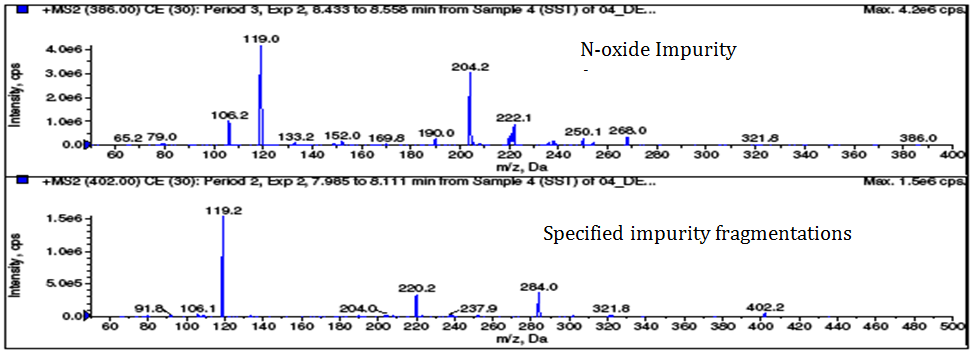 Fig. 2: MS spectrum of specified impurity and MS/MS spectrum of N-oxide and specified impurity