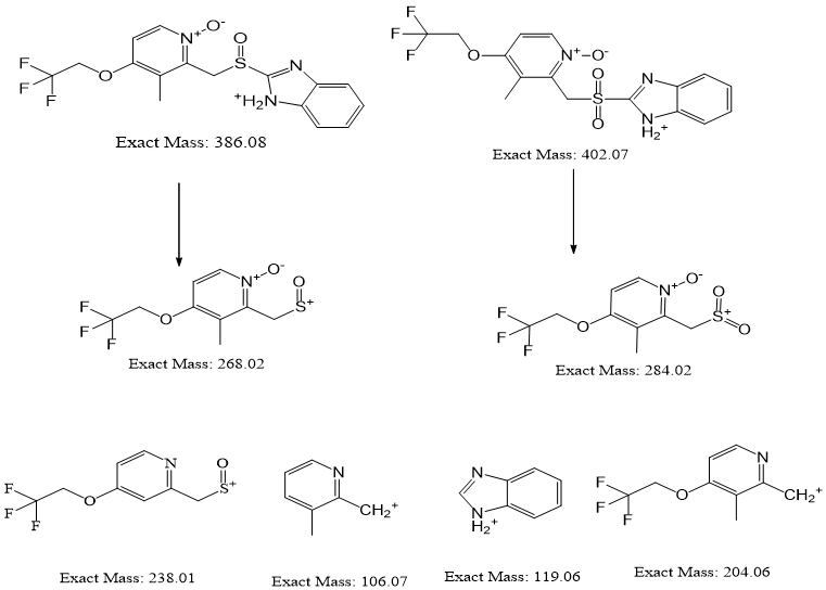 Racemic N-oxide was used in method development and validation study, though two peaks were eluting at the relative retention (RRT) of 0.68 and 0.76 with respect to Dexlansoprazole. Configuration of these two N-oxide peaks was unknown, thus denoted as N-oxide 1 and 2. One impurity was observed in trace level at 0.57 RRT of Dexlansoprazole by MS and identified as m/z [(M+H)+] 402. Exact mass of this specified impurity was 401 Da (i.e., 32 Da more than Dexlansoprazole and 16 Da more than N-oxide), hence N-oxide and specified impurity was further fragmented in MS/MS to predict the probable structure. Common daughter ions (m/z 238, 204,119 and 106) was observed in MS/MS though specified impurity is the related structure of N-oxide. 386, 268 mass was found in N-oxide fragments and corresponding 16 Da more mass 402 and 284 was observed in specified impurity. Hence specified impurity could be Suphone N-oxide. MS, MS/MS spectrum of specified impurity and N-oxide were presented in fig. 2 for better understanding. From the evident of MS/MS fragments probable schemas were drawn and shown in fig. 3.