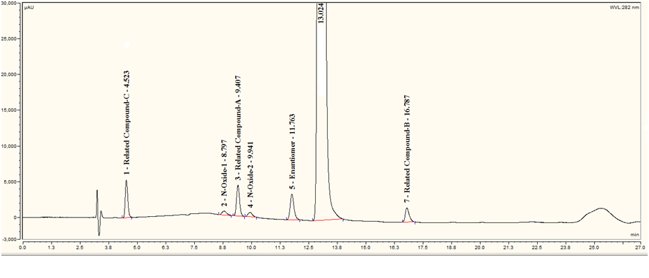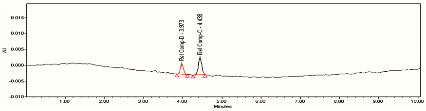 USP listed impurities are well separated with base line separation. Obtained peak purity values are evident for method specific. Related compound-D (i. e EP impurity-E) is not available during the method development, in order to make fully applicable for the developed method, this impurity was purchased from European directorate for the quality of medicines and healthcare (EDQM) and specificity was demonstrated along with the adjacent peak of related compound-C.
